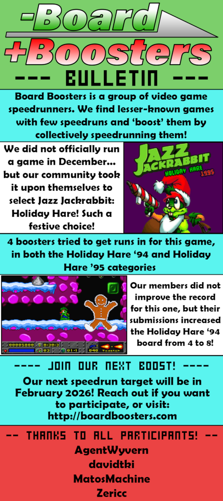 Until it wasn’t! Board Booster club members banded together and decided to take the reins, driving the sleigh themselves. After some deliberation and an official vote tally, our community decided to run Jazz Jackrabbit: Holiday Hare 1994 and 1995! These two games were short holiday episodes for everyone’s favorite green, gun-weilding, MS-DOS hare - Jazz Jackrabbit. Blast your way through winter wonderlands at supersonic speeds, complete with brand new holiday themed soundtracks.