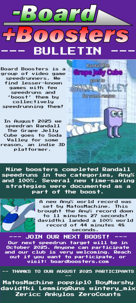 Releasing for PCs at the very end of 2024, Randall the Grape Jelly Cube teleports the player to the N64 collectathon days of yore, complete with an extensive hub world and various bits and bobs to be snatched in order to progress the game’s final areas. With a variety of jumping styles, fellow boosters will quickly find that the game provides the player with many ways to speed through each area. Long jumps and spin jumps can be strung together allowing the player to maintain breakneck speeds that are simple to learn, yet difficult to master.